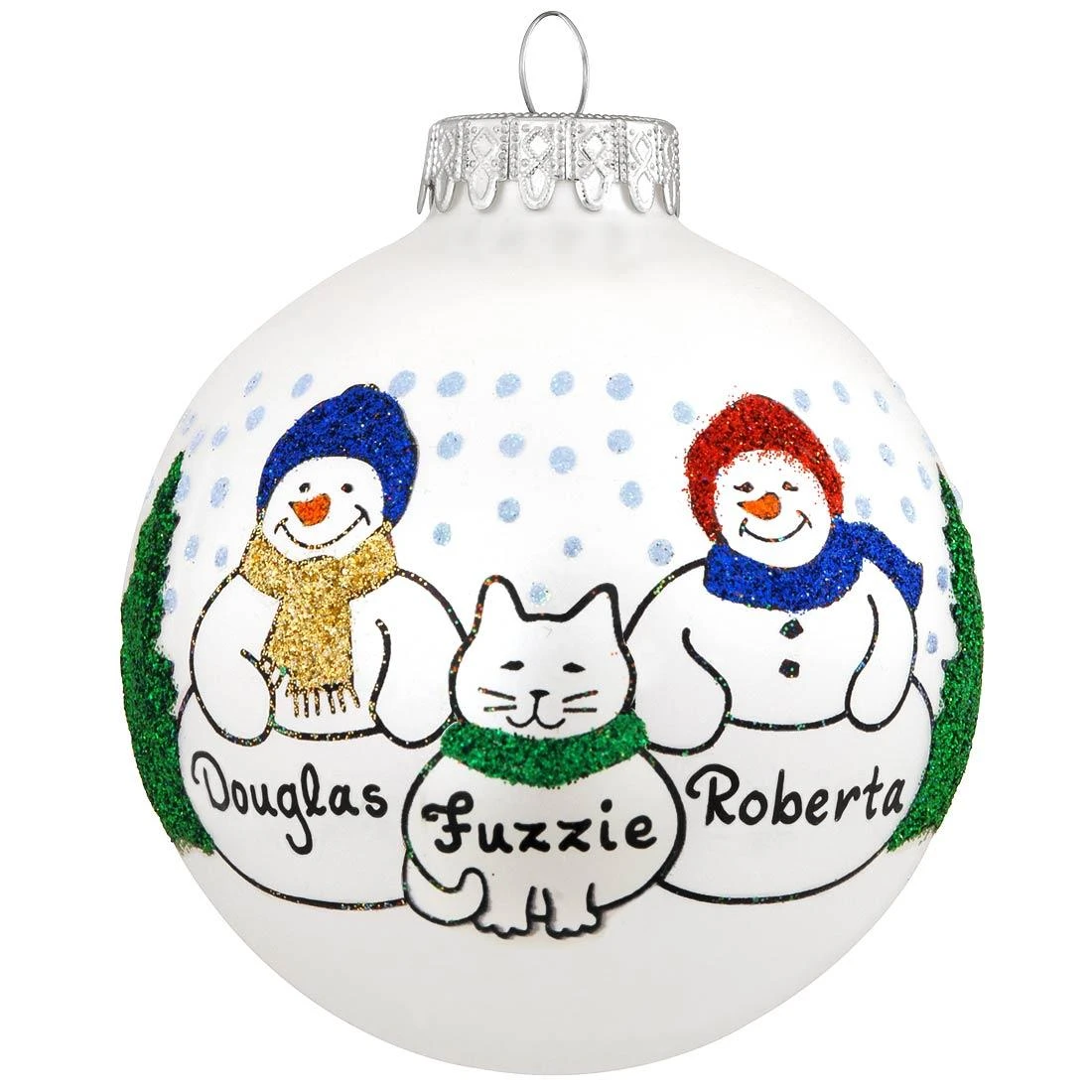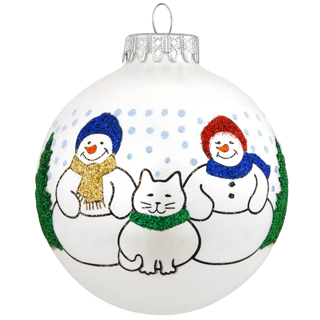 Love and friendship purr-fected! Crafted of glass exclusively for Bronner’s from Hungary, this 4″ tall ornament features two beautiful snowmen and their cute cat in a wintry forest scene with glitter accents for an added appeal. This adorable snowman couple with cat ornament is sure to make a delightful tribute to your favorite feline family member for years to come! Allow one of our professional Bronner’s artists to add a personal touch with a black paint pen at no additional charge!