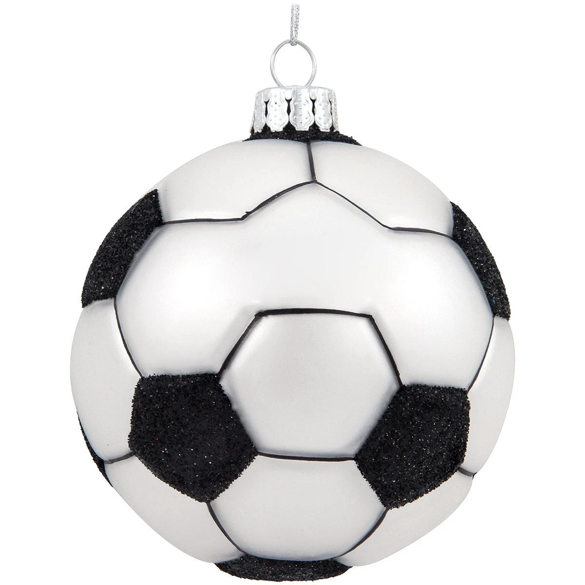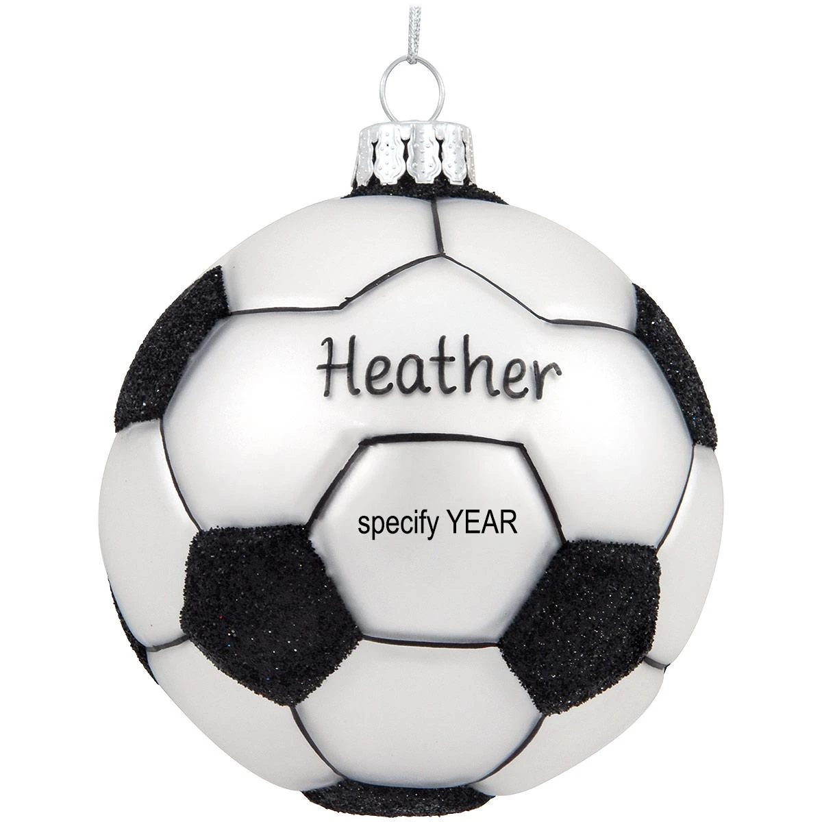 Soccer players and fans alike will get a real kick out of this striking keepsake! Exclusively crafted of glass for Bronner’s, our vibrant black and white soccer ball ornament shimmers with light-reflecting glazes and sparkling glitter accents. Measuring 3¼” tall, this sport-ing keepsake comes ready to hang with a silver cord and can be personalized by one of our talented Bronner’s artists with a black paint pen at no additional charge.