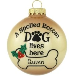 Dog owners really enjoy spoiling their precious pooches rotten! Adorned with a dog bone, sprigs of holly, and a paw print, this charming two tone brown and tan ornament features the sentiment A spoiled Rotten Dog Lives Here. Why not have this “fetching” ornament personalized with the name of your pampered pet appearing in black paint pen at no additional charge?