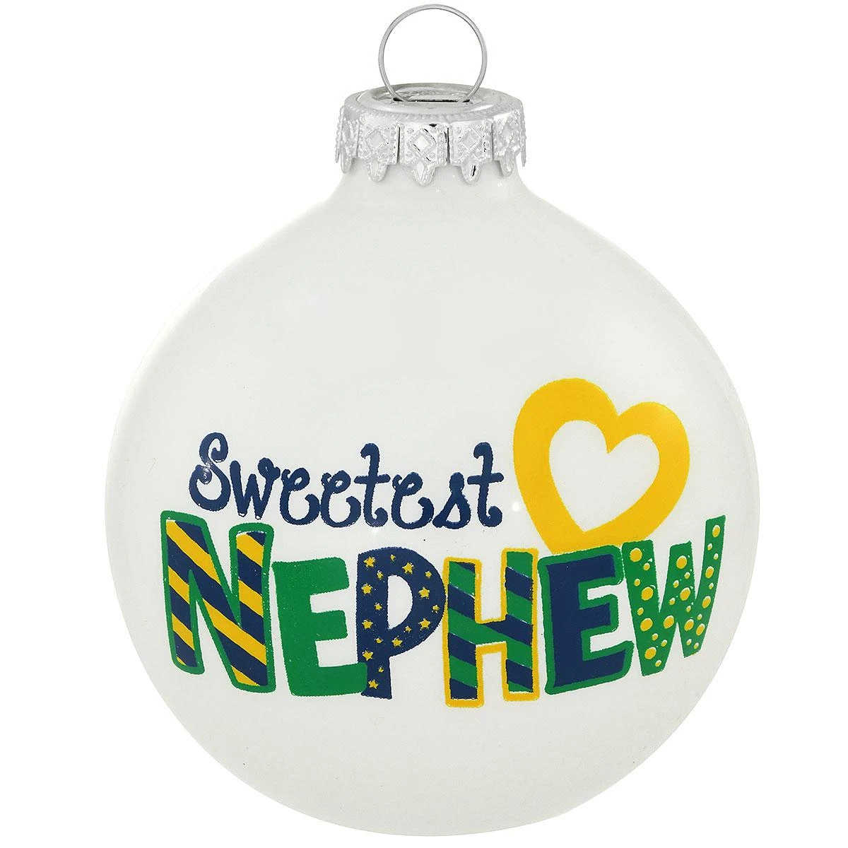 Show your nephew how much he means to you with a gift that will continue to express your feelings for years to come! Exclusively crafted for Bronner’s from Hungary, this 3″ round ornament features the sentiment Sweetest NEPHEW in hues of dark blue, green and yellow. Accented with a sunny, yellow heart, this white glass ornament makes a great gift for your special nephew, especially when personalized by one of our professional Bronner’s artists at no additional charge!