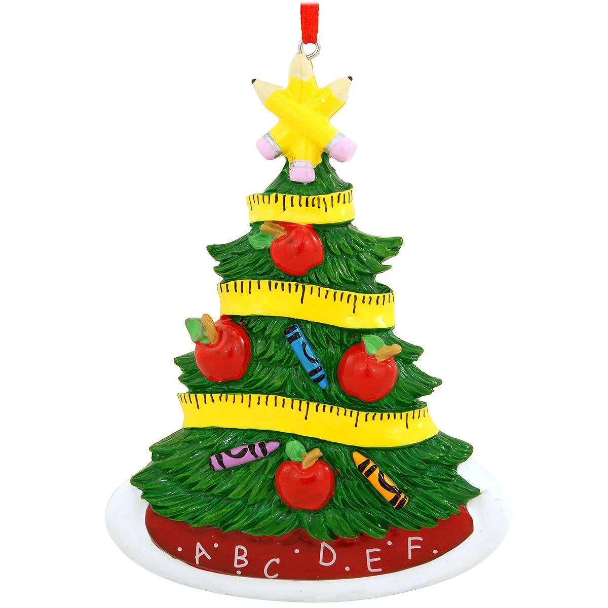Show your appreciation for a special teacher with this imaginative design! From the tip of its yellow pencil star to its red alphabet skirt, our 5″ tall Christmas tree is decorated with shiny apples, colorful crayons, and a ruler-inspired garland. Artfully crafted of resin and coming ready to hang with a red ribbon, this smart ornament can be personalized with your teacher’s name in black paint pen at no additional charge.