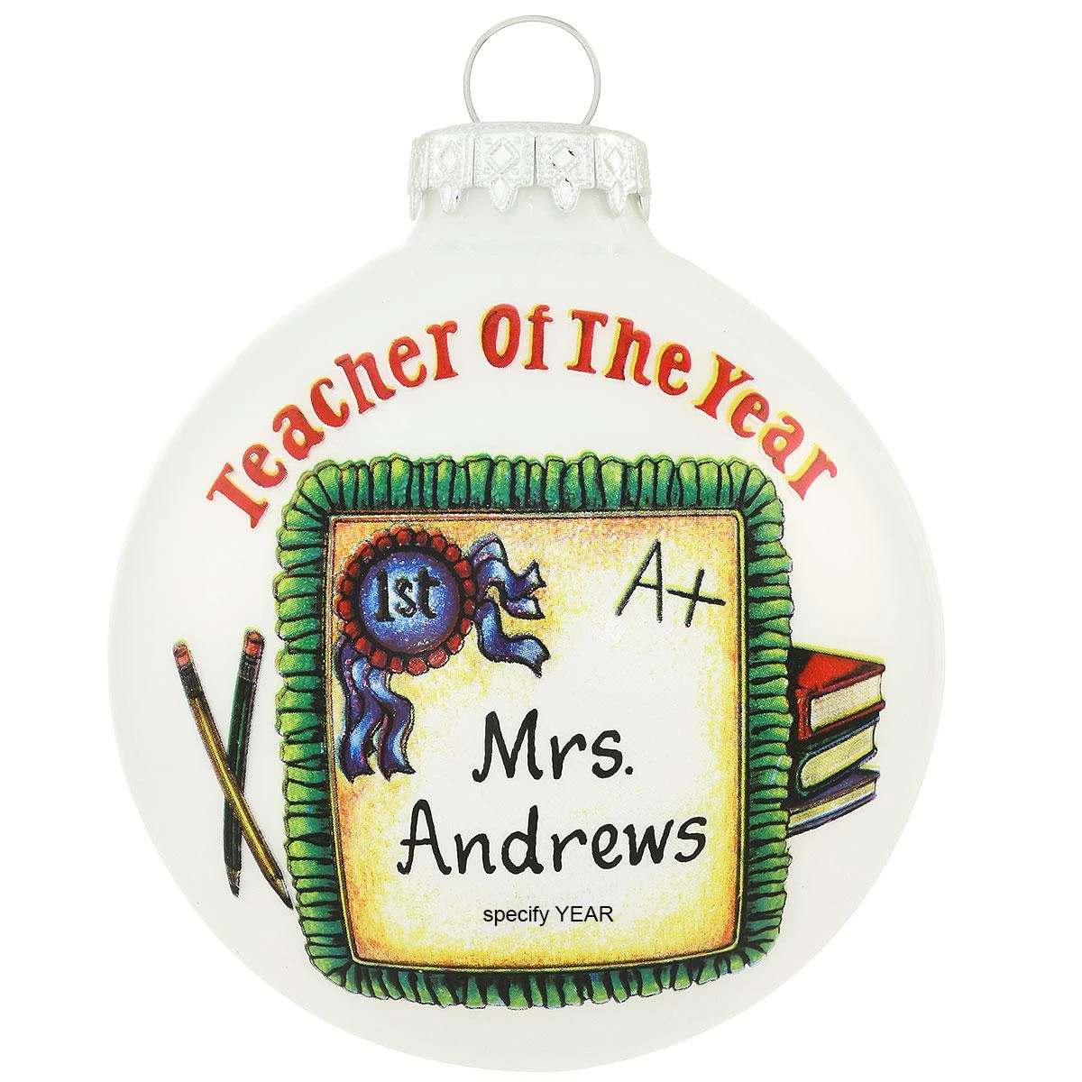 Give top marks to the special teacher in your life with this award-winning design. The sentiment Teacher Of The Year appears in vivid red above a handsome certificate bearing a 1st place blue ribbon and the grade A+. Accented with two crossed pencils and a stack of school books, this 3″ white opal ornament is crafted exclusively for Bronner’s from glass in Hungary and can be personalized for your favorite teacher in black paint pen at no additional charge.
