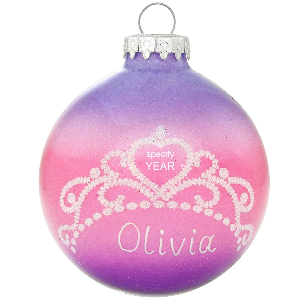 This enchanting tiara keepsake is sure to be the crown jewel of her ornament collection for years to come! Crafted of glass exclusively for Bronner’s from Hungary, our 3″ tall sparkle ornament has an interior coating of shimmering glitter that shines through the clear glass in 3 warm tones of amethyst, pink and violet. Your special princess will love the elaborate tiara and heart design accented with iridescent white glitter. Give her the full royal treatment when you allow one of our professional Bronner’s artists to add her name with a white paint pen at no additional charge!
