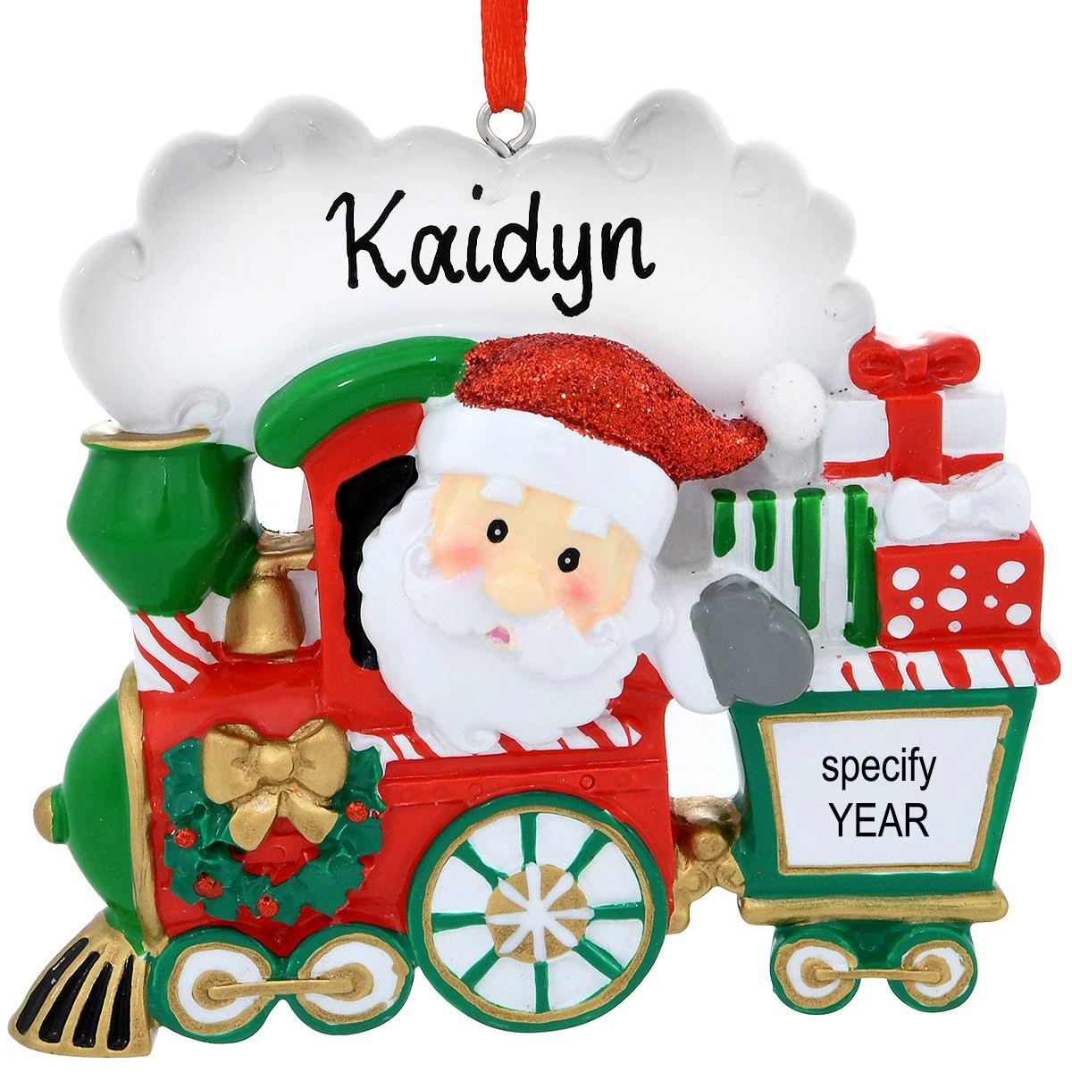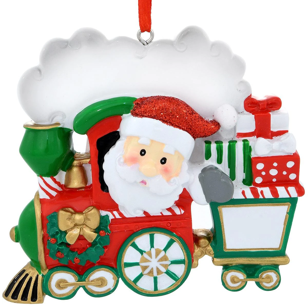 Toot….Toot! Here comes Santa on his Polar Express delivering fun gifts and toys for good girls and boys! Showing Santa waving from his holiday train, this festive 3¼” tall x 3½” wide keepsake is crafted of resin and is accented with dazzling red glitter and colorful glazes. Coming ready to hang with a red ribbon, our train with Santa and gifts ornament can be personalized at no additional charge by one of our talented Bronner’s artists using a black paint pen.