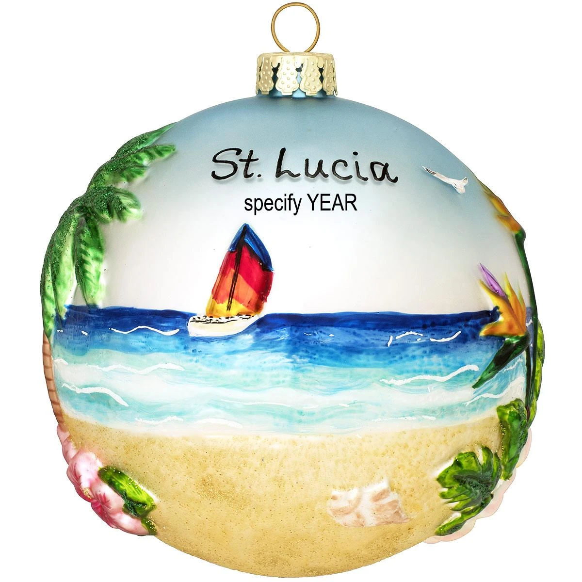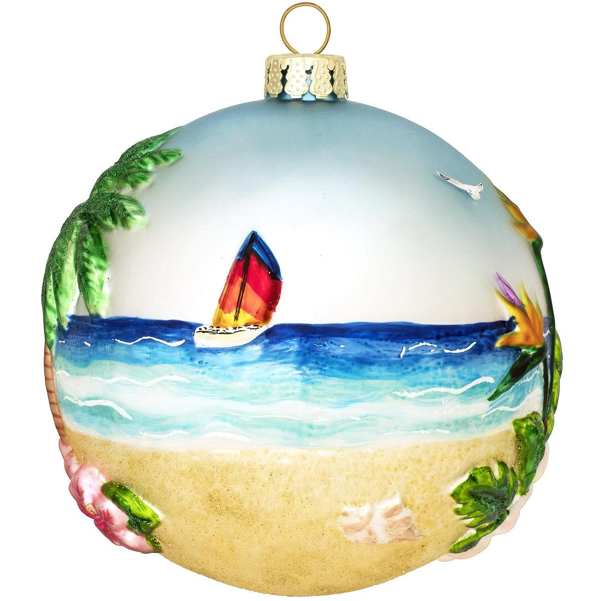 Framed by lush tropical flowers, this sunny seascape depicts a sandy beach bordered by a tranquil bay dotted with colorful sailboats. Textured with an artful 3-dimensional look, seagulls circle gracefully in the azure sky above as the serene scene encircles the entire surface of this gorgeous 4″ tall x 4¼” wide ornament. Crafted of glass exclusively for Bronner’s, our extraordinary tropical relief sphere ornament comes ready to hang with a gold cord and will make a great memento of your special getaway! Allow one of our talented Bronner’s artists to add a personalized touch with a black paint pen at no additional charge.