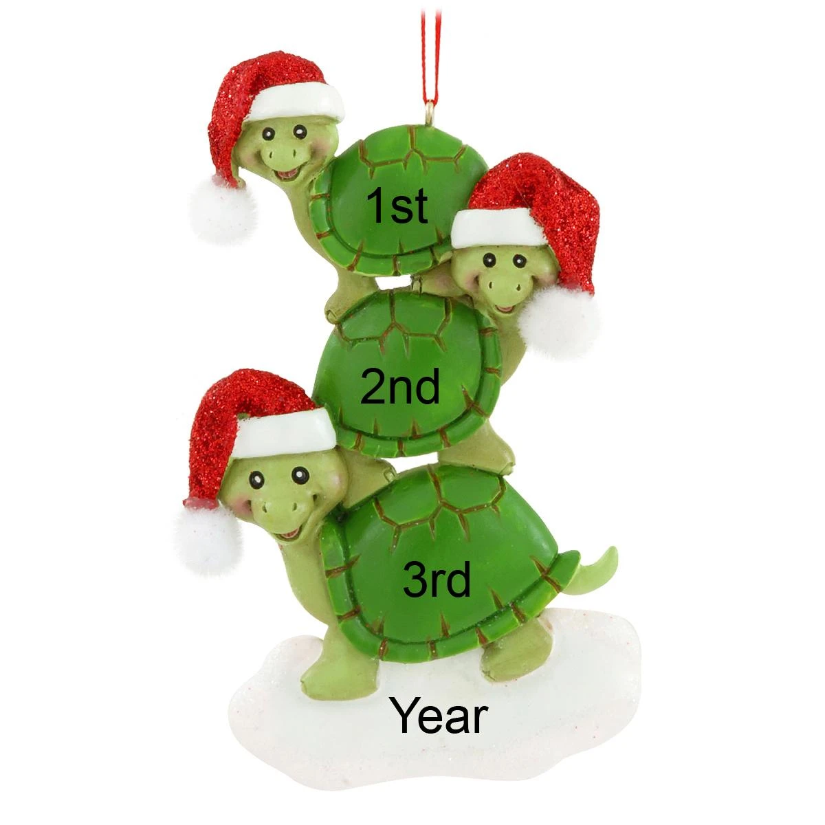 Anyway you stack it up, a family is built on love! Shell-ebrate the togetherness you share with this adorable turtle family of 3 with Santa hats personalized ornament. Crafted of resin in colorful detail, this charming 5″ tall ornament comes ready to hang with a red ribbon. Allow one of our professional Bronner’s artists to add a personalized touch with a black paint pen at no additional charge. The holiday season always goes by so fast, why not slow it down a hare with this cute ornament!