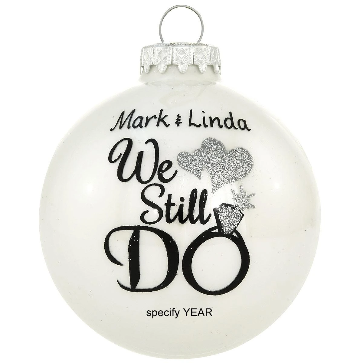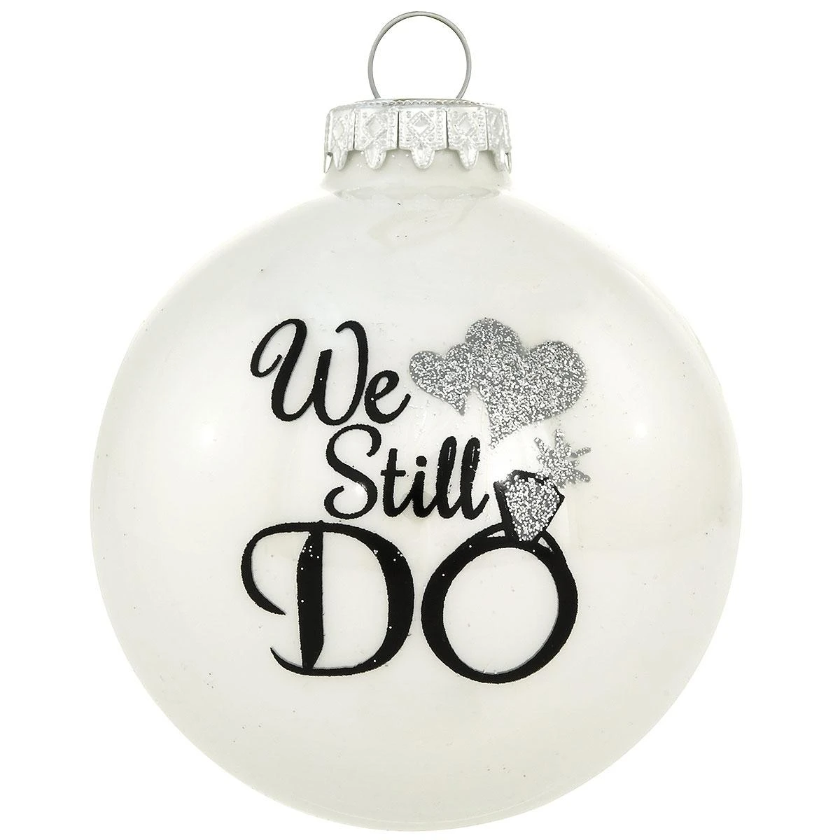 Perfect for a loving couple celebrating a special wedding anniversary or renewing their marriage vows, this unique keepsake features the sentiment We Still Do in a bold ebony script. Accented with two glistening hearts and a diamond ring sparkling with silver glitter, our 3″ round, glass ornament is crafted in Hungary exclusively for Bronner’s and is sure to be treasured for many happy years to come! Allow one of our talented Bronner’s artists to add a personalized touch with a black paint pen at no additional charge.