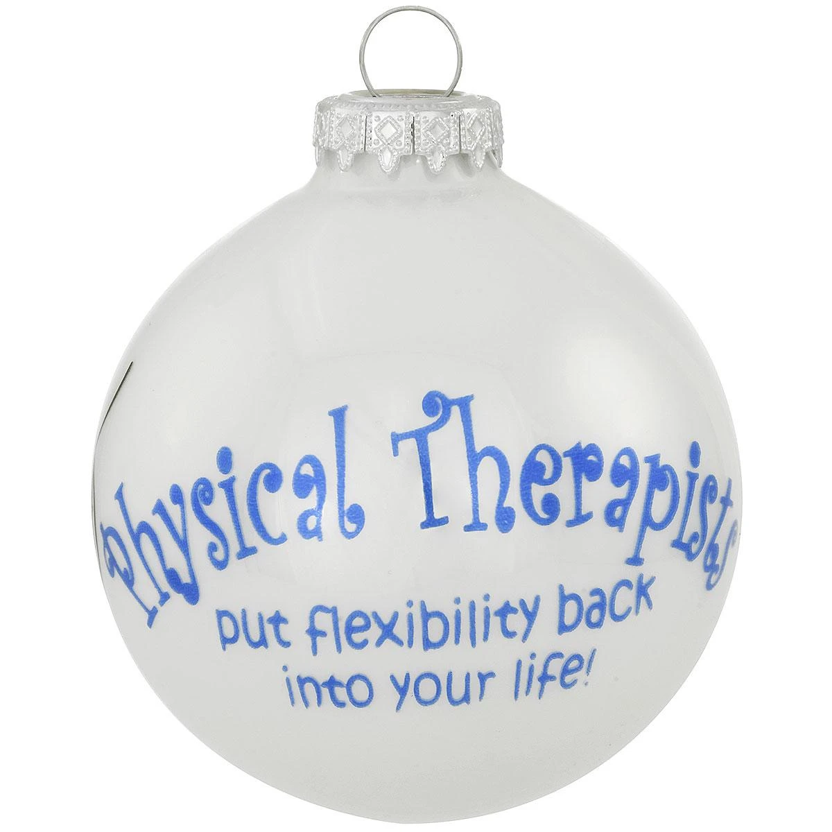 Featuring a physical therapist sentiment in vivid blue, this shimmering white opal ornament depicts a black outline of a physical therapist’s hands gently messaging the hand of a patient. Crafted in Hungary exclusively for Bronner’s, our glass ornament measures 3″ round. Sentiment reads: Physical Therapists put flexibility back into your life! This charming physical therapist ornament is sure to be a treasured keepsake for years to come!