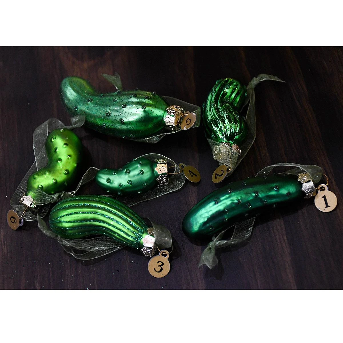 Santa doesn’t dilly-dally when it comes to Christmas fun—he enjoys hiding pickle ornaments on the tree for the whole family to find! This charming set of glass ornaments features 6 different pickles, each bearing a numbered tag and coming ready to hang on a gossamer ribbon. Game suggestions are included on back of box, or get creative each year and invent new games to play! Ornaments range in size from 1½” – 3¼” tall.