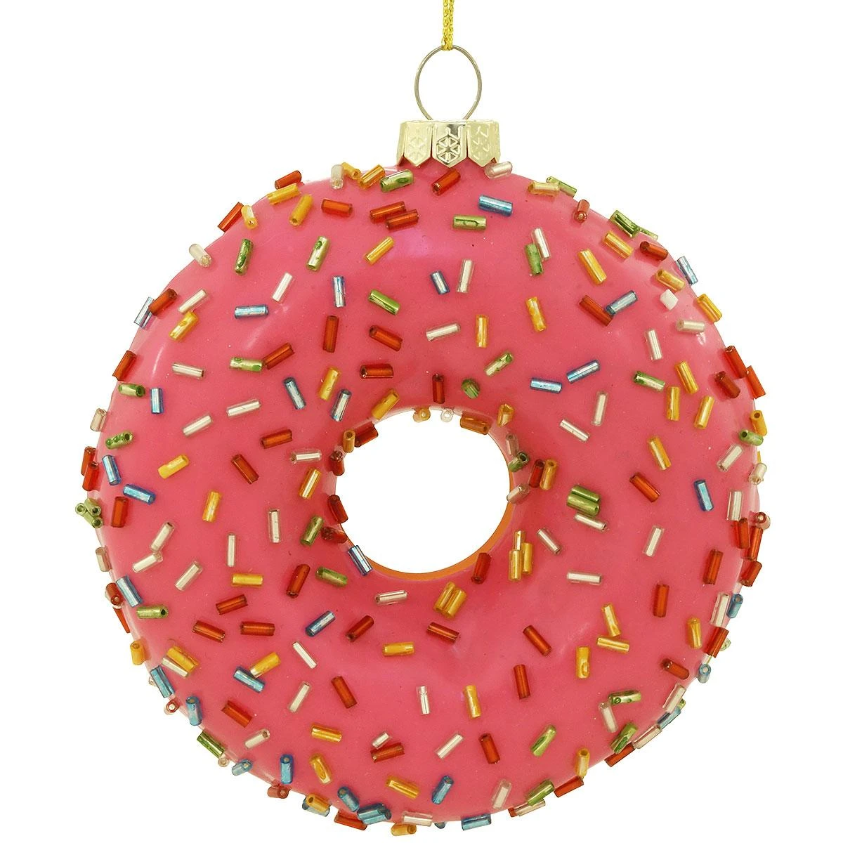 “Donut” hesitate to sprinkle your tree with this breakfast favorite! Depicting a golden fry cake topped with pink frosting and candy sprinkles, our 4″ doughnut ornament is artfully rendered in glass. Coming ready to hang with a gold cord, this mouth-watering keepsake makes a sweet addition for food and dessert themed trees!Â