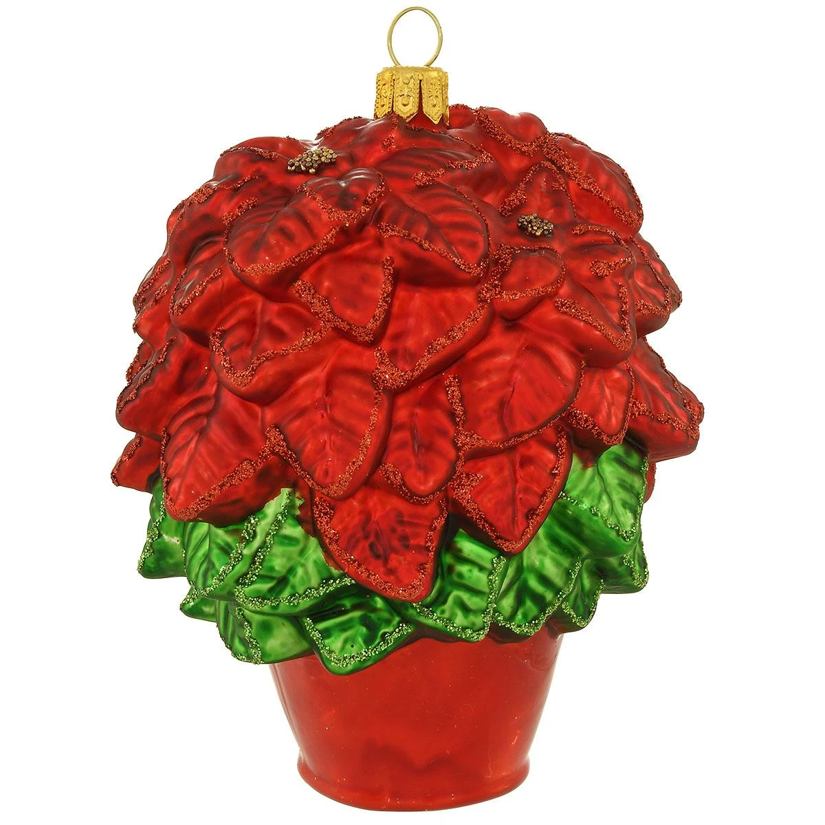 You don’t have to have a green thumb to enjoy this beautiful poinsettia for years to come! Artfully mouth blown in glass, our 4″ poinsettia in pot ornament is expertly hand-painted with red and green glazes and glistening glitter accents. Made in Poland. Includes Legend of the Poinsettia card.