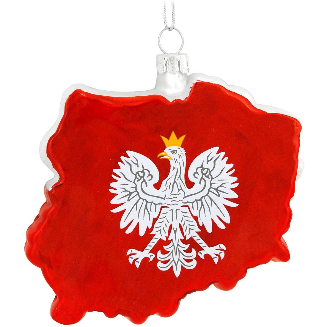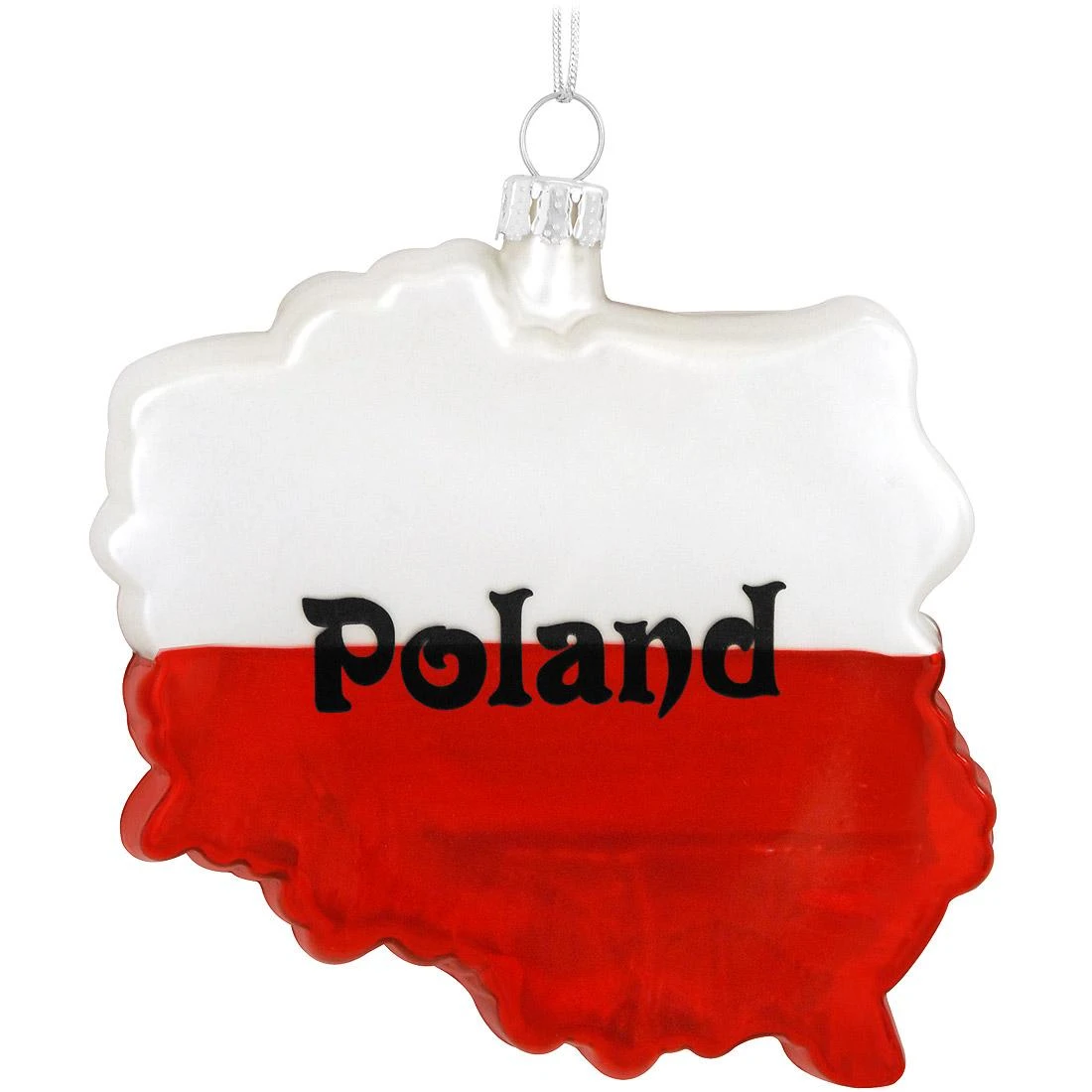 Polish-off your ornament collection by adding this magnificent keepsake! Our blown-glass Poland ornament cleverly captures the shape and flag of that grand land in shimmering colors. Measuring 3¼” tall, this meticulously crafted ornament displays the flag colors and name “Poland” on the front, and the national coat of arms (a white eagle) on the back. A beauty for the Polish and all those who love them!