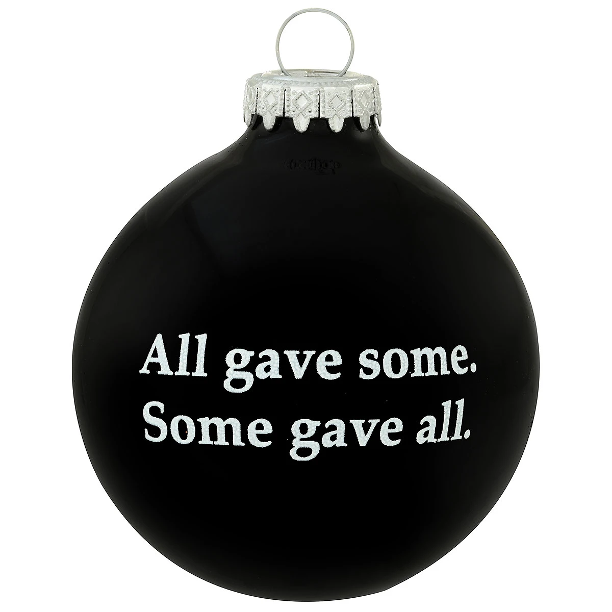 The silhouette of a prisoner of war with a guard tower and barbed wire in the background appears in white on this vivid black ornament along with the sentiment POW * MIA and You are not Forgotten. Crafted of glass in Hungary exclusively for Bronner’s, our 3″ keepsake honors the resolve to never forget America’s POWs or those military members who served their country in conflicts and are still missing. The sentiment All gave some. Some gave all. appears on the reverse side of the ornament.