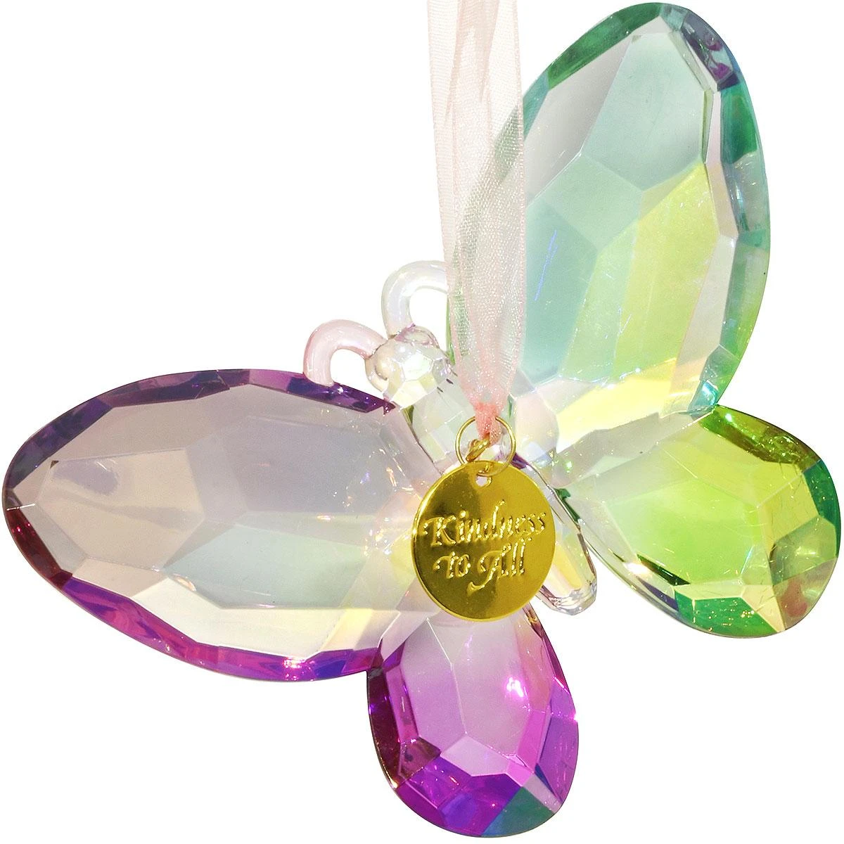 It’s only fitting that this symbol of transformation and hope changes colors with a shift in the light! Our beautiful pink and green rainbow butterfly ornament is crafted of acrylic with a cut crystal effect and encourages everyone to smile bigger, breath deeper, and have the strength to soar! Perfect for the tree or window pane, 3″ tall x 4″ wide keepsake comes ready to hang on a pink gossamer ribbon with a charm that reads “kindness to all”.