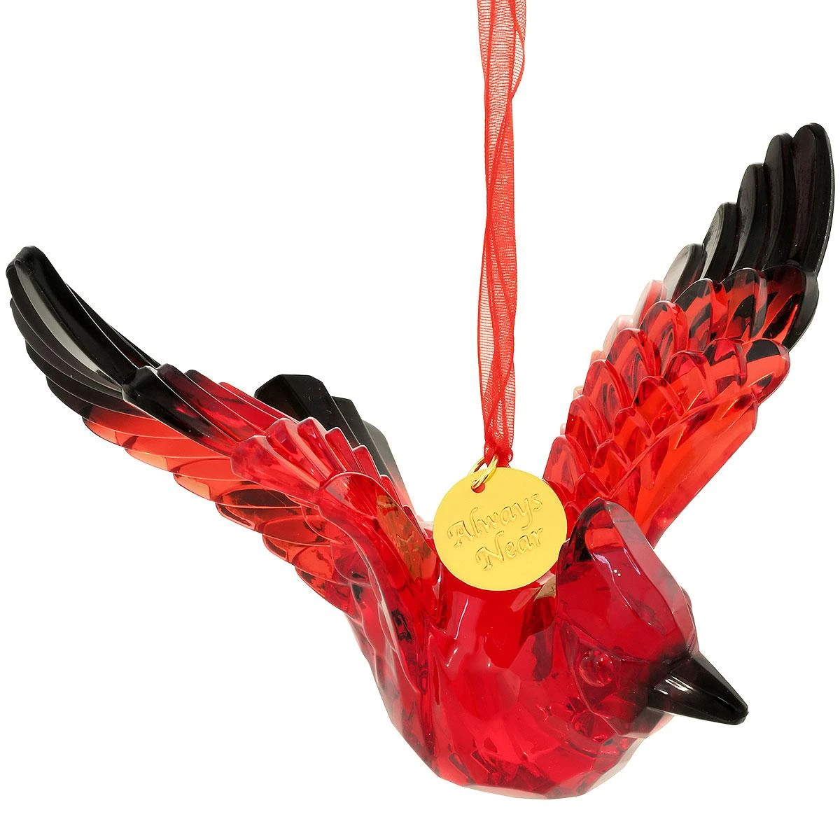 Wings outspread in flight, this beautiful red acrylic cardinal carries a special message on a gold metal charm: Always Near. A cardinal’s presence is reassurance that your loved one is always with you when you need them…all you have to do is look up. Coming ready to hang on a red gossamer ribbon, this beautiful bird ornament measures approximately 4″ tall x 5″ wide and includes sentiment card with “Cardinal Messenger” memorial poem.