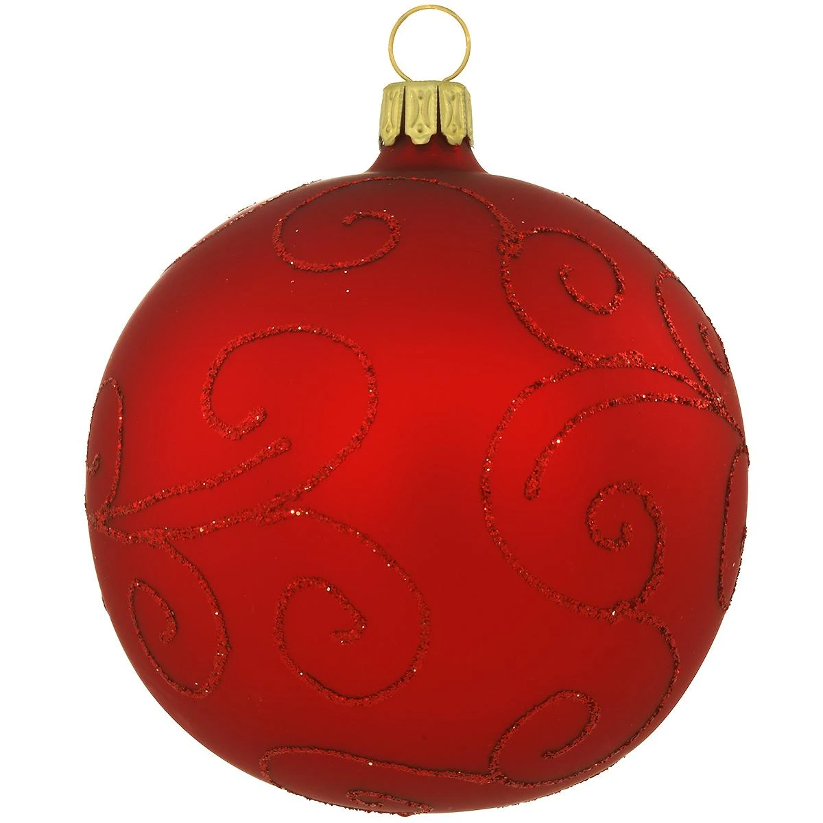 Radiant as a ruby, this beautiful red ornament shimmers and glimmers with swirling designs of glistening red glitter. Adorned with a gold cap, 3¼” ornament is skillfully crafted of glass in Germany.