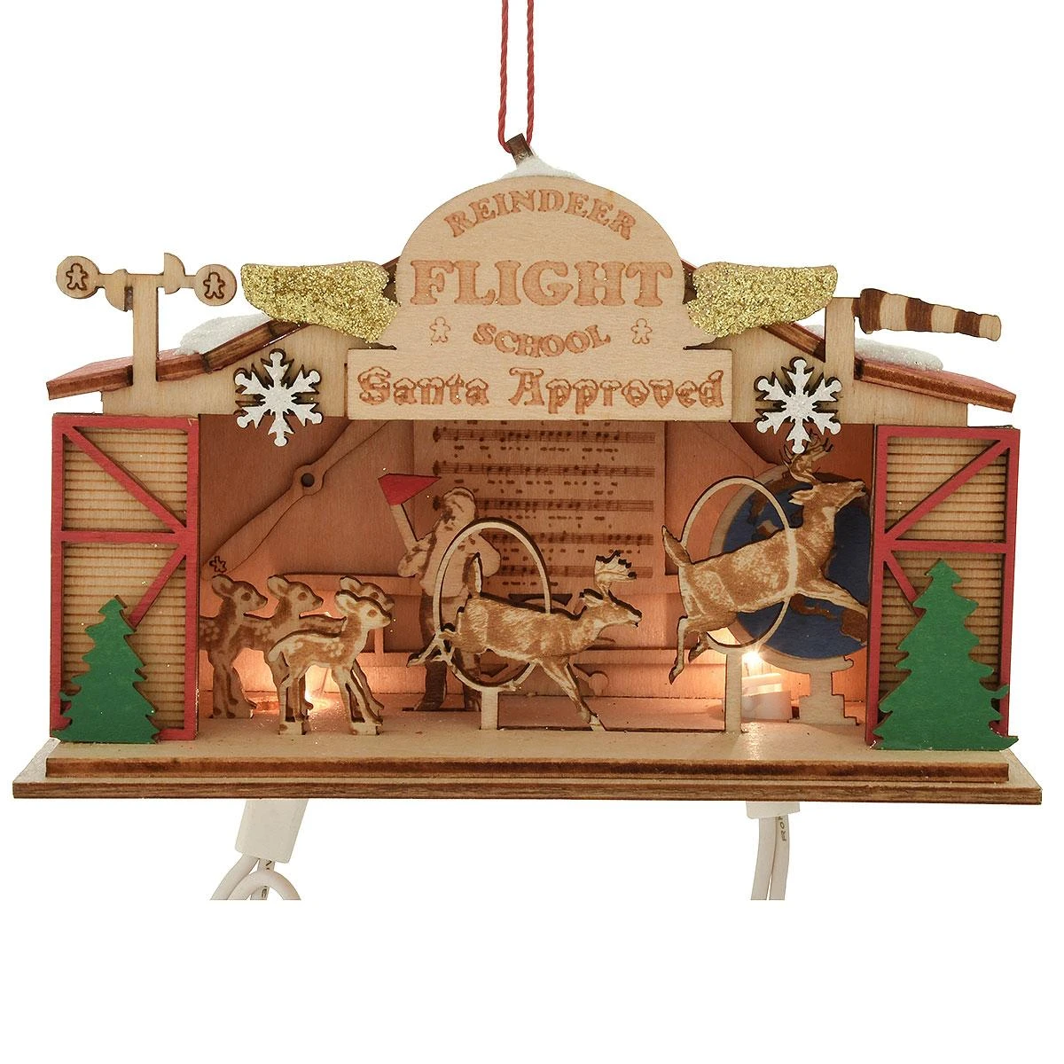 Made from wood with Christmassy touches from red and green, this “Reindeer Flight School” ornament depicts Santa and his magical reindeer training the fawns to fly. Is it Dasher or Dancer, or Prancer and Vixen? Donner and Cupid or Comet or Bitzen? You can decide! Measuring approximately 3″ tall by 5¼” wide, this festive design features an extra magical touch from shimmering glitter and has two holes in the base for illumination. (Lights in picture are not included.)