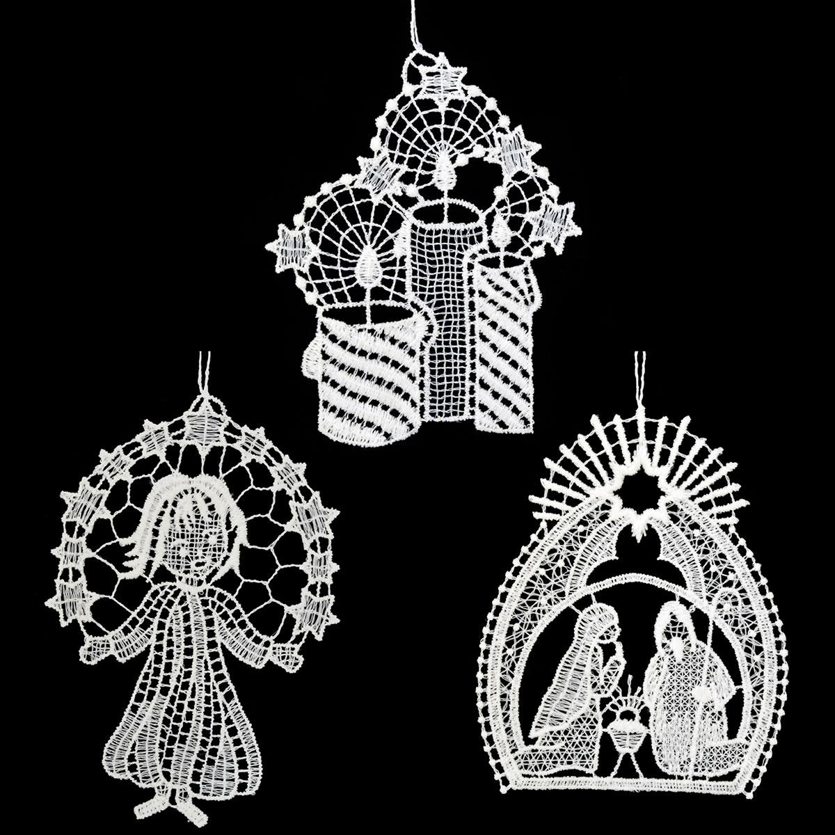 Comprised of 3 religious-themed designs, this stunning lace trio is sure to fill your holidays with home-spun charm. Hand-crafted of fine white thread in Germany, lace ornament designs include 3½” nativity scene, 4″ girl (angel) with star trail, and 3¾” candle trio.Â
