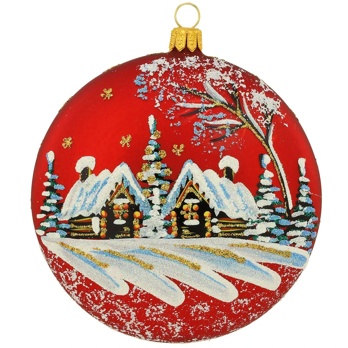 Adorned on both sides with a captivating snow scene, this enchanting round red medallion ornament is sure to become a treasured favorite. 4″ glass ornament depicts two cozy cabins nestled in the woods and shimmers with colorful glitter accents. Handmade in Poland.