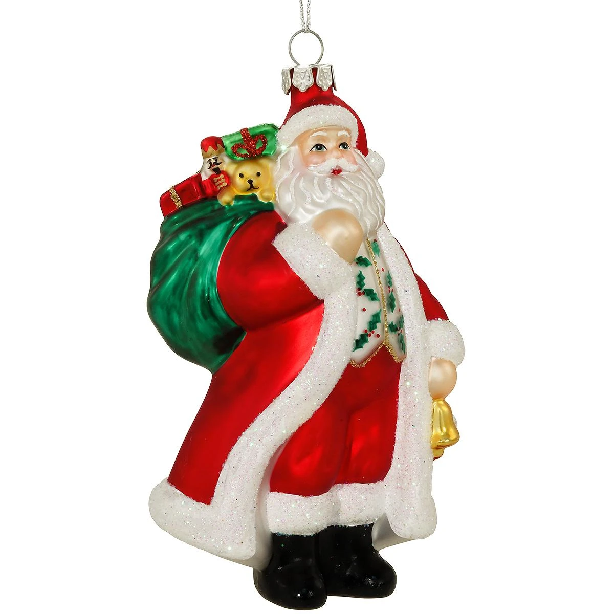 Santa’s looking quite holly-jolly in a vest with festive holly pattern! Equipped with bell and sack of gifts, St. Nick’s all set to b-ring in the season of giving. Artfully detailed in glass with vivid glazes and glitter accents, ornament comes ready to hang on a silver cord and measures 5″.