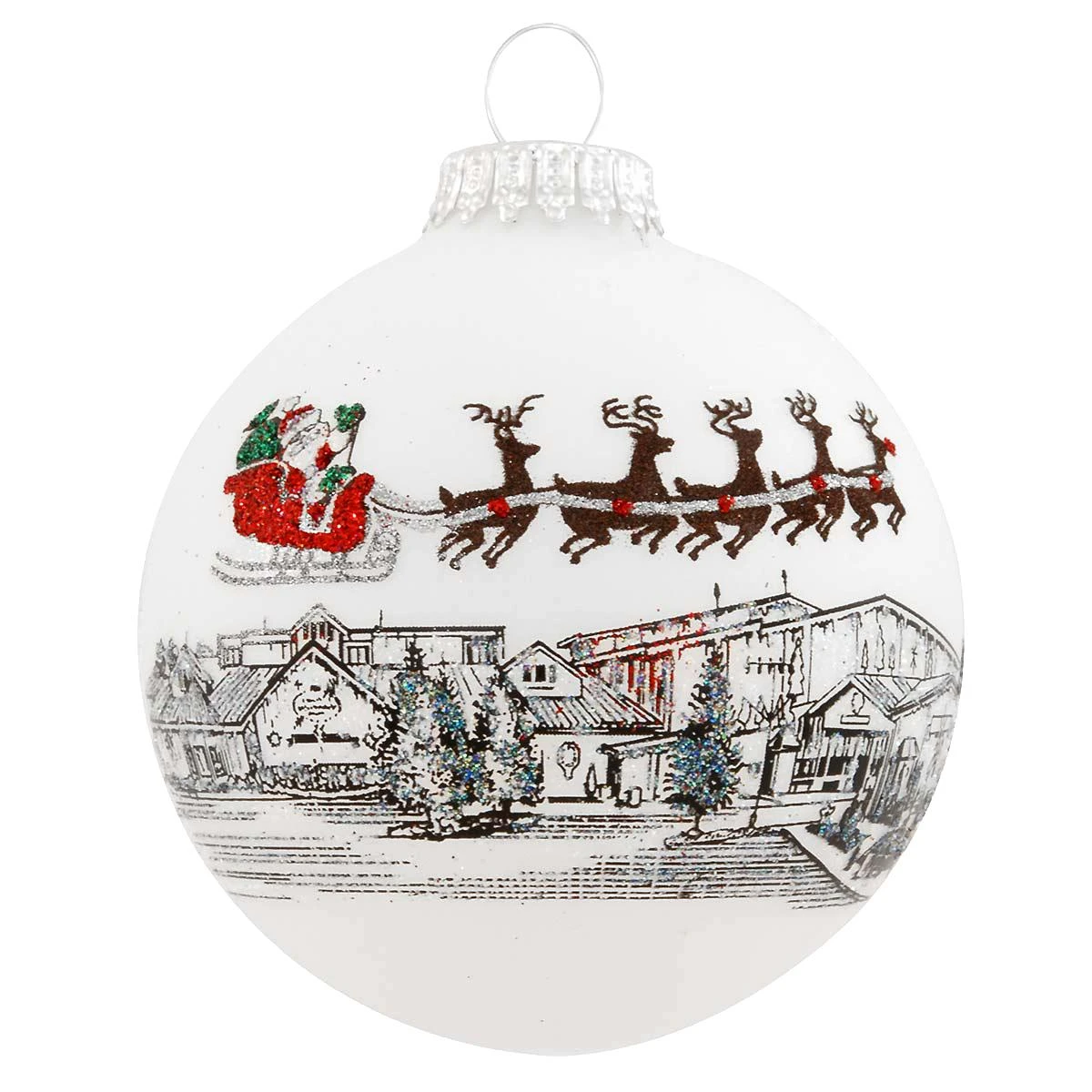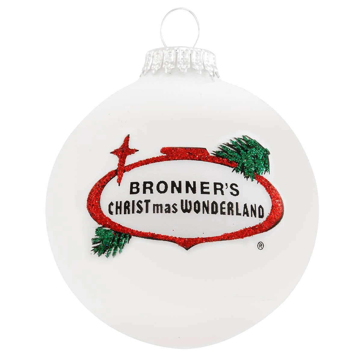 On Dasher…..On Donner…..Let’s head to Bronner’s! Whether he’s shopping for the Mrs. or treating his reindeer to a de-light-ful aerial view, Santa loves to visit the World’s Largest CHRISTmas store! Our Bronner’s exclusive 3¼” tall ornament depicts Santa and his sleigh flying over an amazingly detailed depiction of Bronner’s CHRISTmas Wonderland. This festive design comes complete with dazzling glitter accents and displays Bronner’s iconic red and green logo on the reverse side.