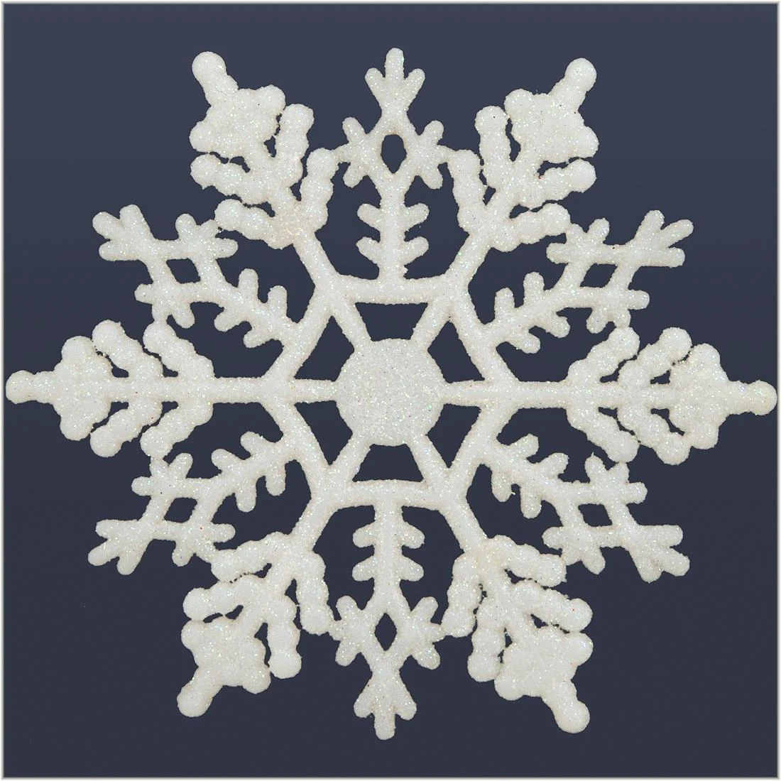 Create a blizzard in your home or office with this set of 24 white and iridescent snowflake ornaments! Made of durable shatterproof plastic, each ornament in our snowflake set is 3¾” tall and covered in white and iridescent glitter. This white and iridescent snowflake ornament set is an easy way to decorate a winter-themed tree!
