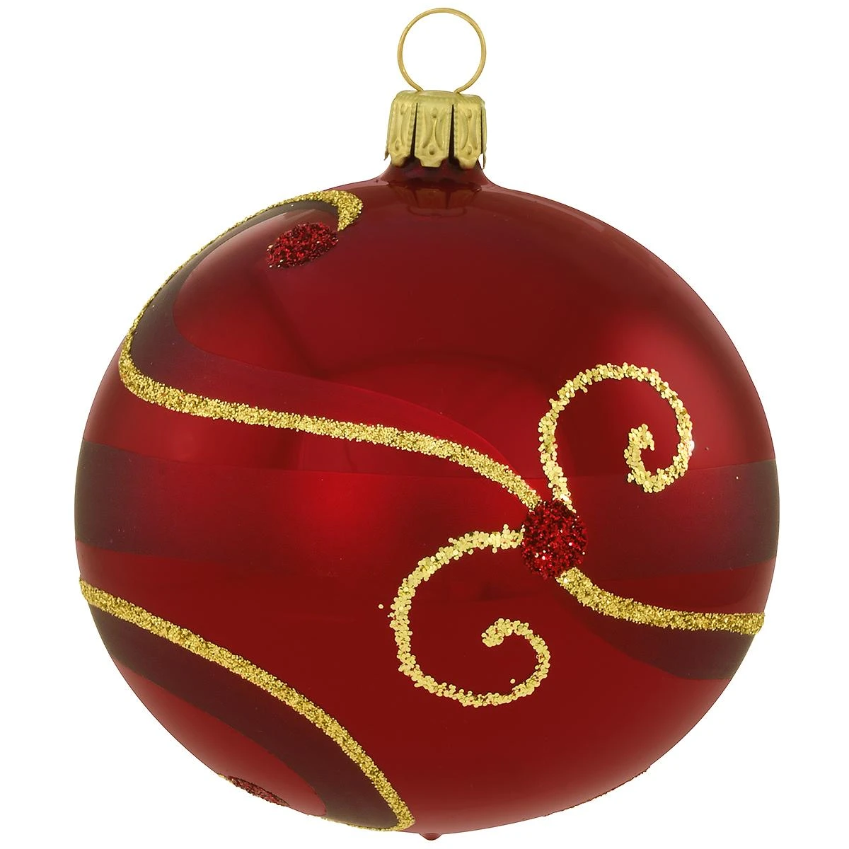 Graceful lines of gold glitter dip and swirl around this shiny burgundy design. Adorned with matte accents and red glitter circles, this eye-catching glass ornament is sure to add elegance to your décor for many seasons to come! Hand-crafted in Germany, ornament measures 3″.
