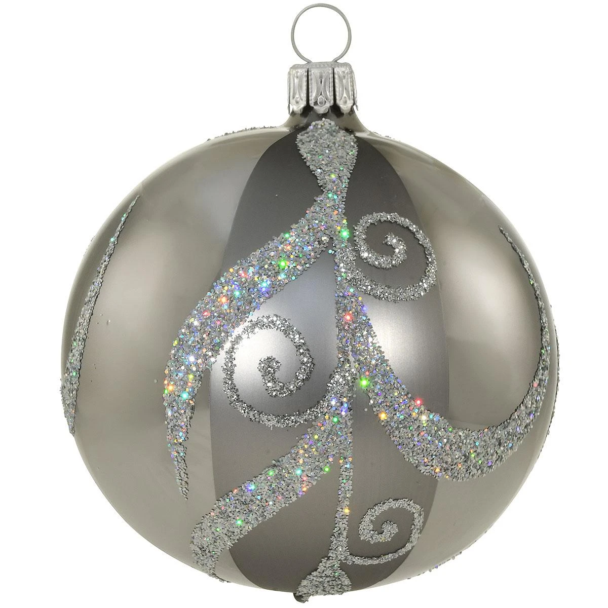 Produced by glassmasters in Germany according to time-tested trade traditions, this 3¼” round ornament is sure to “leaf” admirers in awe of its beauty! Alternating pinstripes of satin and reflective silver are punctuated by scrolling leaf designs in a stunning holographic silver glitter.