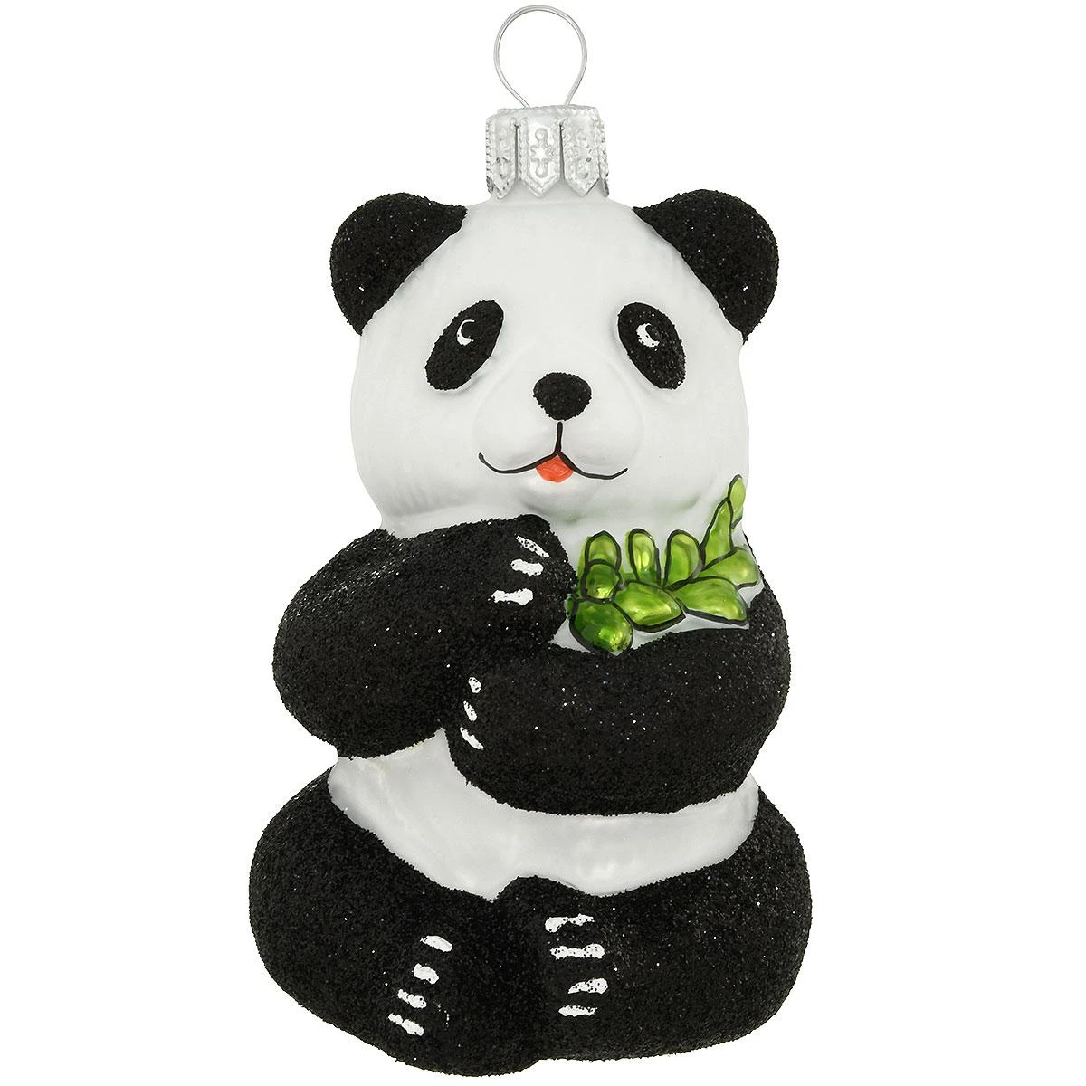 Munching on tender bamboo leaves, our happy Panda is black and white and cute all over! Hand-painted with eye-catching glazes and dazzling glitter accents, our sitting panda bear ornament is expertly hand-crafted of glass in Poland and measures approximately 3¼ tall. A spectacular addition for your animal-themed tree, this cute little critter is apt to cause a panda-monium of excitement for many years to come!