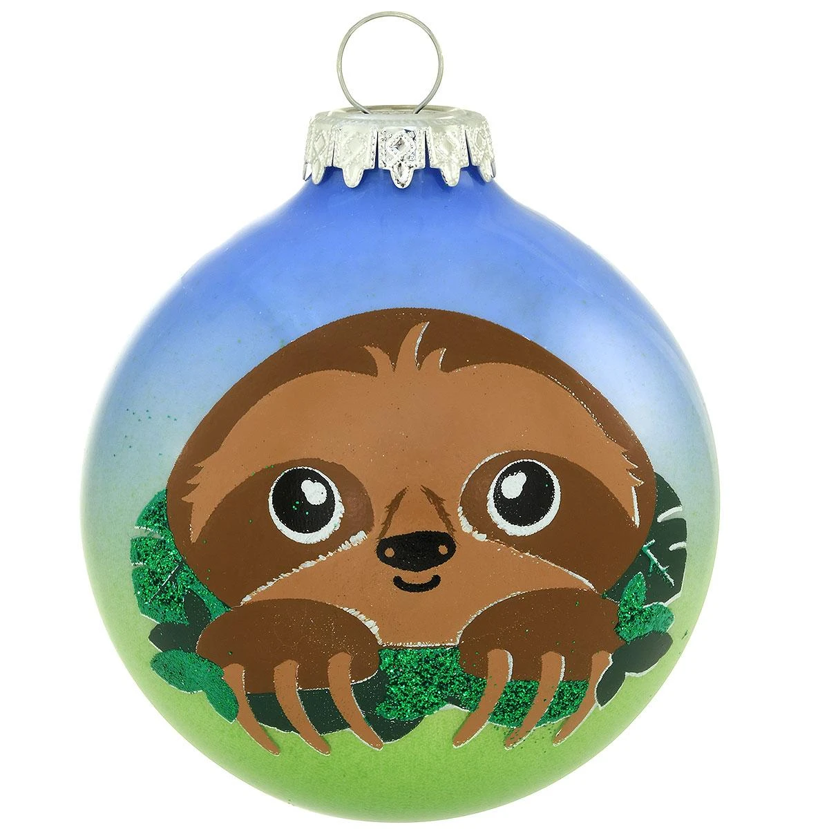 Peeking out from a canopy of dazzling rainforest leaves, our smiling sloth would love to hang around your tree at Christmastime! Accented with a myriad of colorful glazes and dazzling green glitter accents, our whimsical 3″ tall Bronner’s exclusive ornament is beautifully crafted of glass in Hungary and shimmers with a cheerful blue and green two-tone surface. This delightful design will make a great gift for animal lovers.