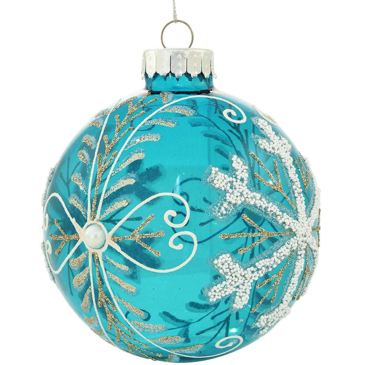Enchanting, frosty, magical….all are apt descriptions for this winter wonderland beauty! Expertly crafted of glass, our transparent teal ornament features a sparkling snowflake design on both sides along with feather-like patterns adding their frosty touch. Featuring myriads of white beads, sparkling gold and silver glitter, and shimmering pearl jewels, this captivating 4″ round ornament comes ready to hang with a silver cord and is sure to charm all who spy it for many holiday seasons to come!