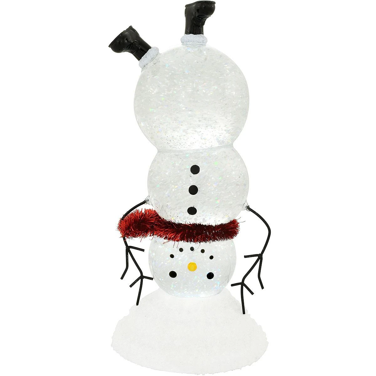 Handstands are challenging when you have a round body and puny sticks for arms! Dressed in his best red scarf and black boots, our upside down snowman enjoys a whole new view of the holidays with his head firmly planted in the snow. Artfully crafted of acrylic and resin, this adorable snowman flip shimmer dome lights up with a cheery glow as prismatic glitter circles playfully inside. Battery operated, this 10½” tall figure features an on/off switch at base and requires 3 AA batteries, not included.