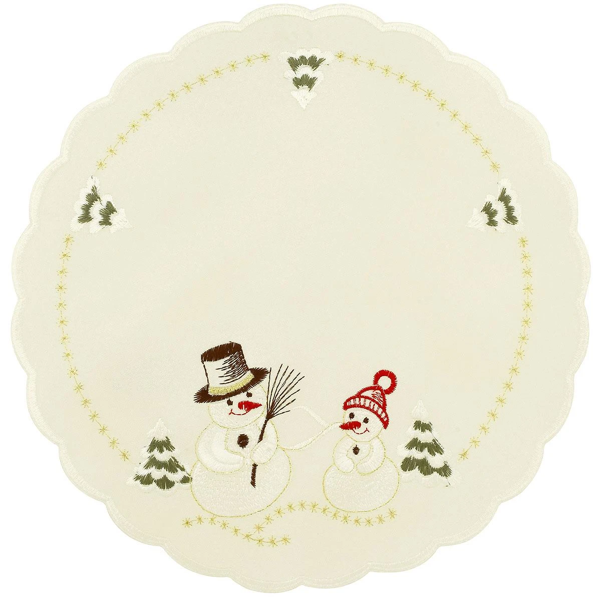 A jolly snowman couple and pine tree theme add a charming appeal to this scalloped, 11.1″ round ivory doily. Adorned with vivid stitching, this beautiful table runner is crafted of 100% polyester and is machine washable. Made in Germany.