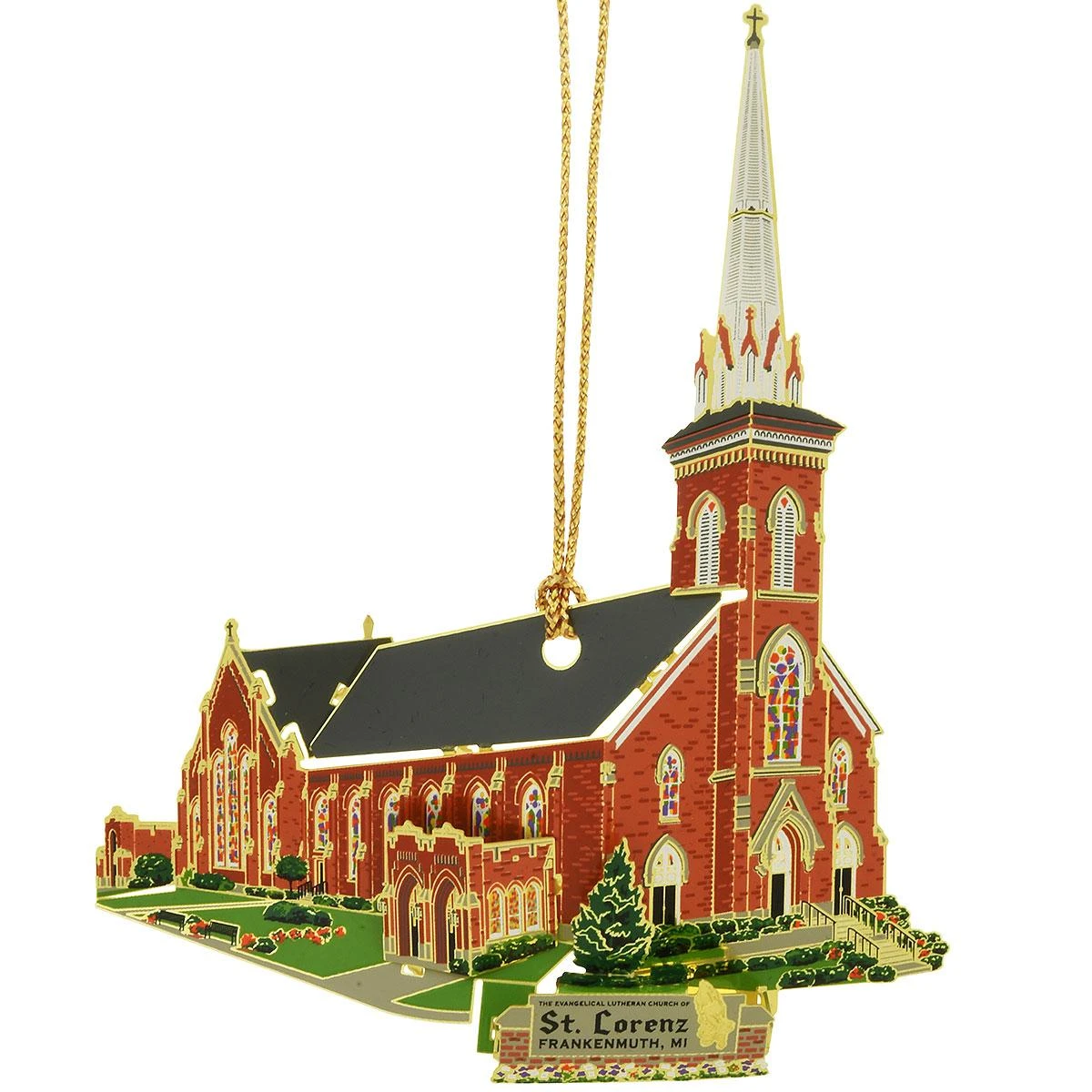 Crafted of solid brass, this exclusive 3½” ornament depicts the historic St. Lorenz Church in Frankenmuth, Michigan. Replicating the landmark building’s beautiful red brick exterior, prominent spire, and numerous stained glass windows, this commemorative keepsake comes ready to hang with a gold cord and makes an ideal souvenir of your trip to Michigan’s Little Bavaria!Â