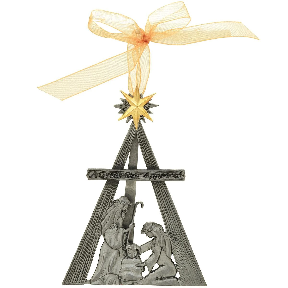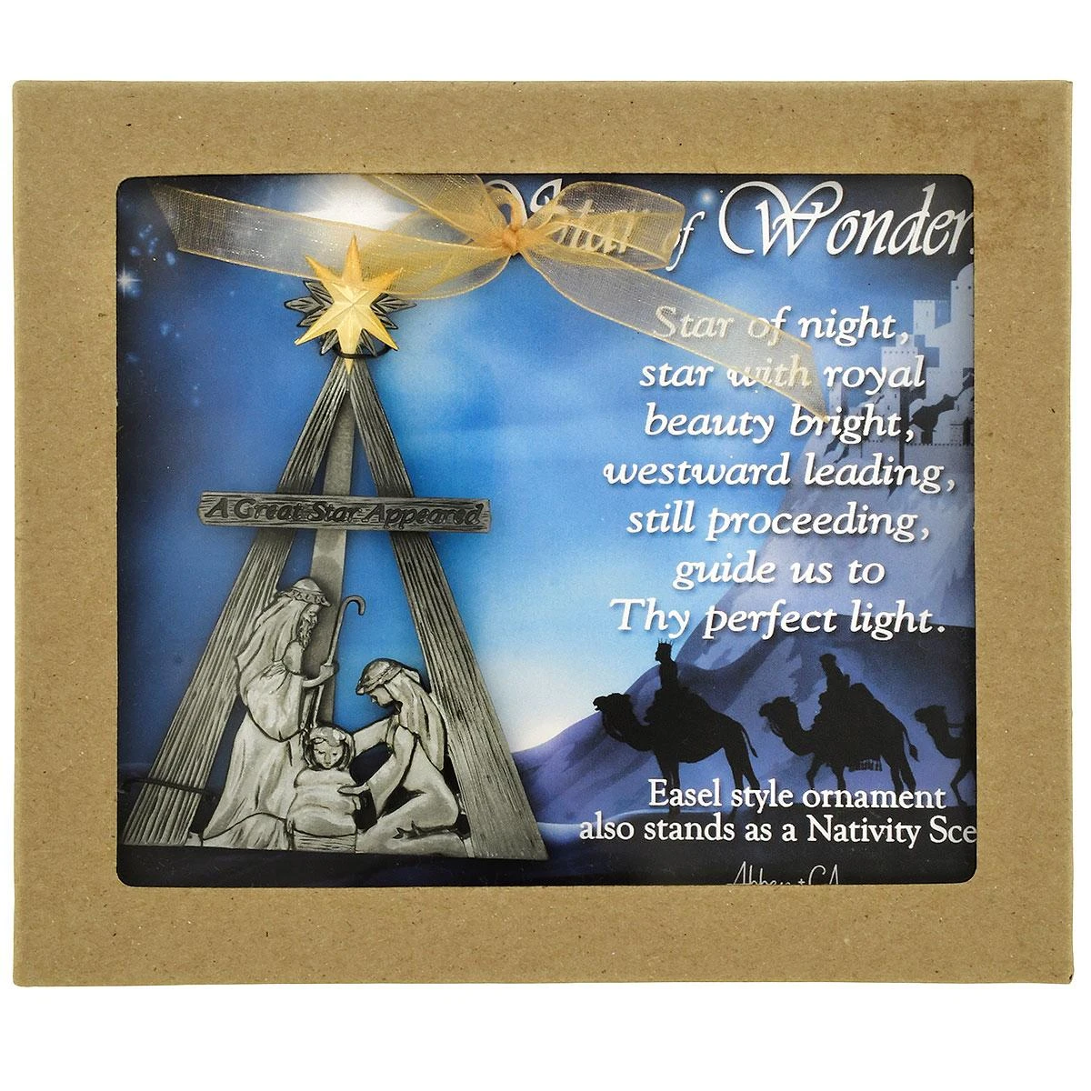 Crafted of metal and embellished in silver enamel, this meaningful ornament features the holy family enveloped in the radiant beams of the Christmas star. Etched with the sentiment “A Great Star Appeared”, this easel style ornament comes ready to hang on a gossamer ribbon or can be displayed standing as a nativity scene. Measuring 3¾”, keepsake comes beautifully boxed for convenient gift giving.Â