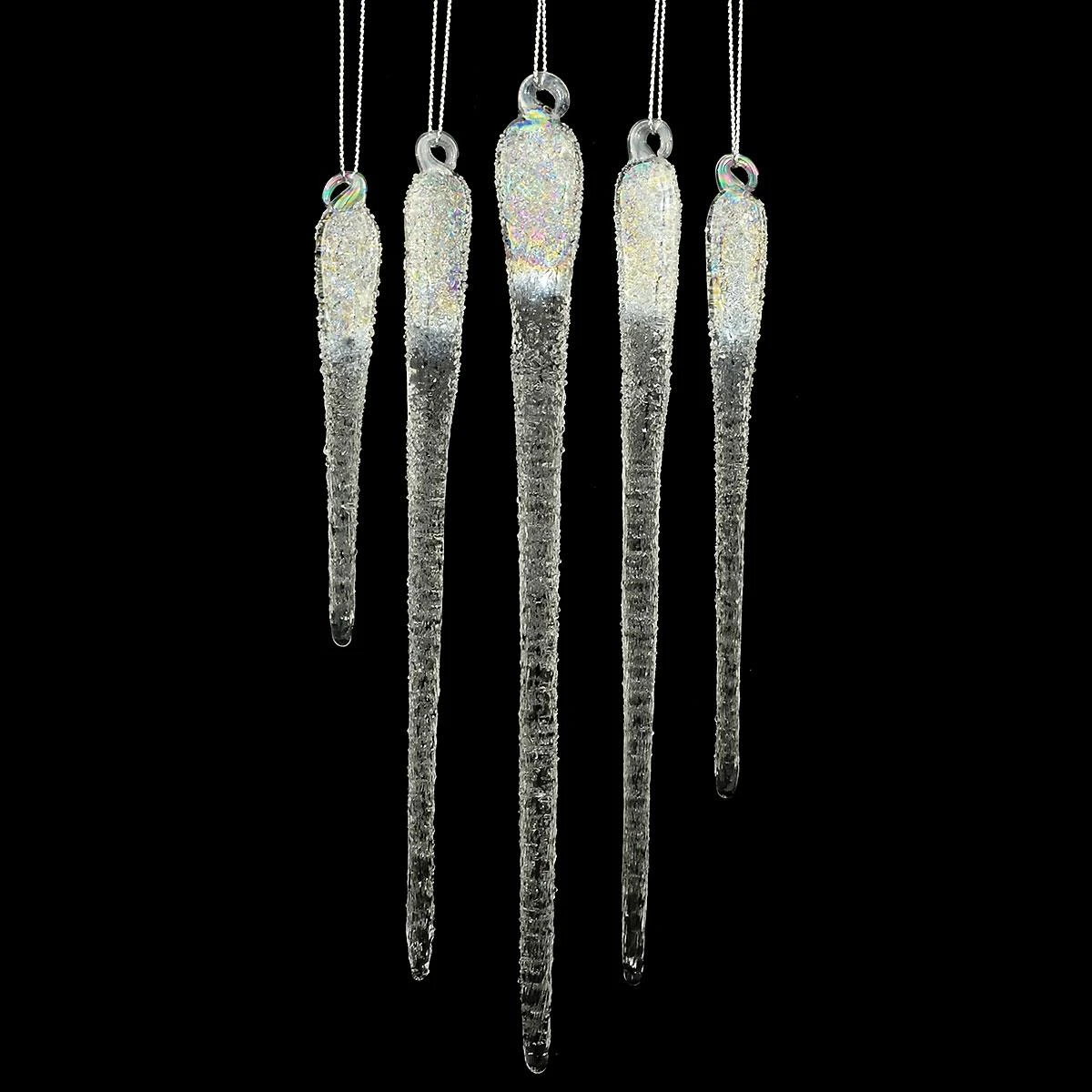 Adorn your Christmas tree with these spectacular clear glass icicles. Ranging in height from 4¼” – 6¼” tall, 5 glass icicles are beautifully textured with iridescent beading and come ready to hang with silver cords. Set is beautifully boxed for gift giving and includes “Tears of Joy, The Story Of The Icicle” that reads: