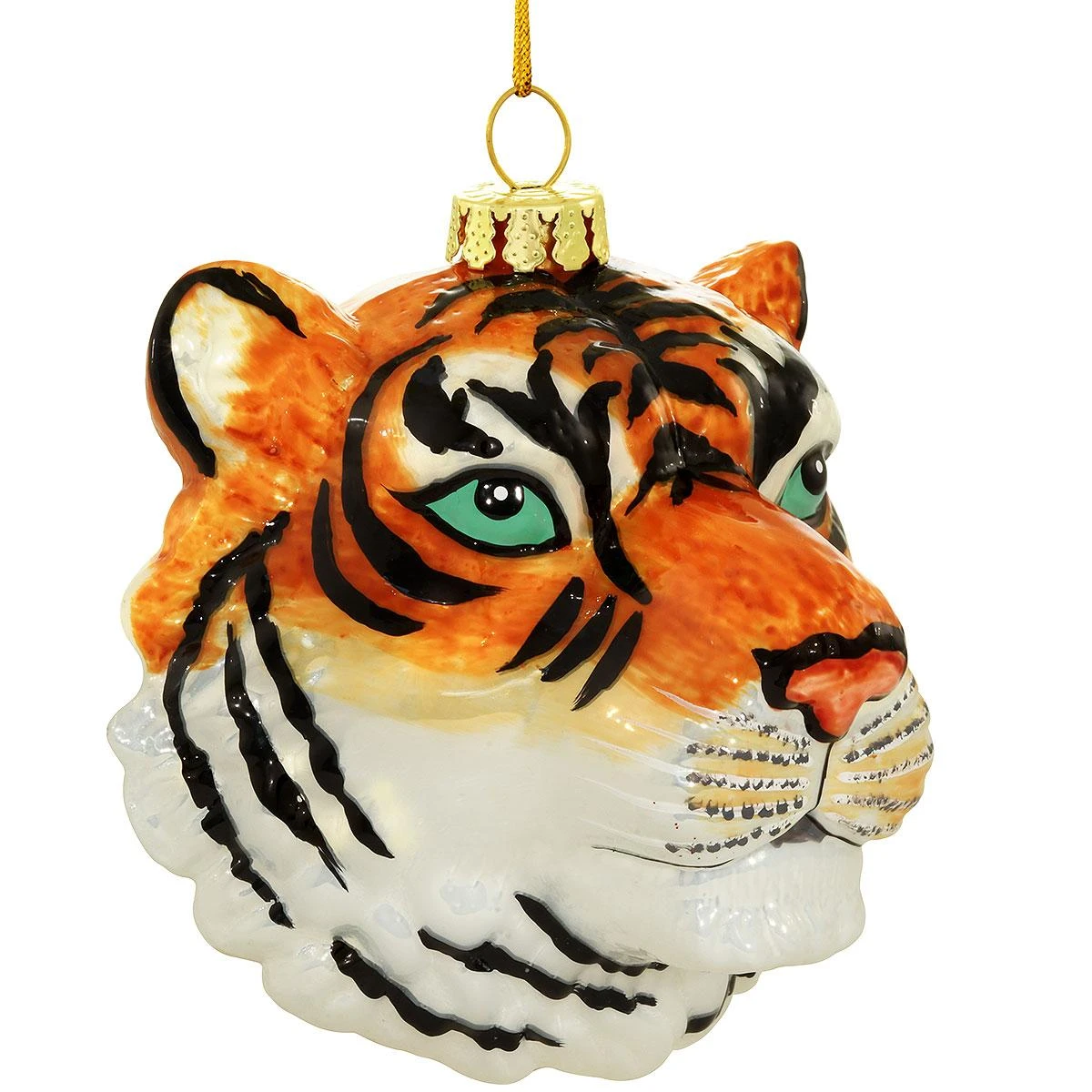 Need a grrrrreat gift for your animal lover? This amazing tiger head ornament depicts the king of the forest with striking face markings and unblinking green eyes. Hand-painted in shimmering hues of orange, yellow, white and black, this 3½” glass keepsake comes ready for display on a gold cord. Symbol of the Tiger card included.