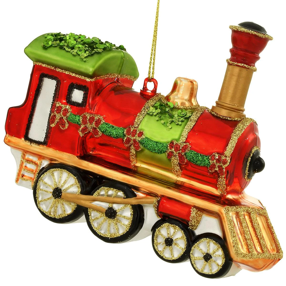 You won’t need a ticket to enjoy this charming holiday train! All decked out in garland and bows, our festive engine shimmers with bright glazes of red, green, and gold along with eye-catching glitter accents. Coming ready to hang with a gold cord, glass and resin ornament measures approximately 3¾” tall x 4½” wide.