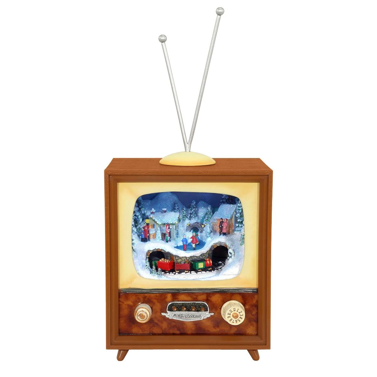 Is there anything good on TV tonight? I bet it can’t compete with this captivating Christmas display! Ingeniously constructed and skillfully crafted of polymers and hand-painted resin, this 10″ tall diorama is reminiscent of an old fashioned console TV with its wood-grain look and metal rabbit ears. Peer through the clear viewing screen to spy a miniature village complete with tiny people, small houses, and diminutive train. Turn the right knob on the television console and the locomotive revolves around its track! The village buildings simultaneously light up while 8 of your favorite Christmas tunes play with a delightful music box sound. This enchanting TV with revolving train display and music box just may keep you entertained for hours at a time! Requires 3 AAA batteries (not included).