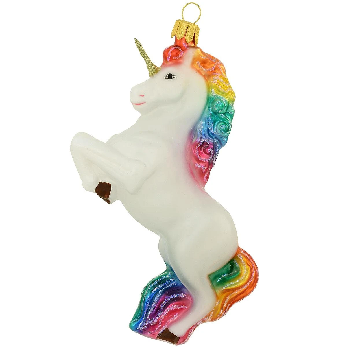 A vision of legend and dreams, our magical unicorn boasts a mane and tail in dazzling rainbow colors. Sure to tickle any unicorn lover’s fancy, this mythical and mystical creature is crafted of glass and sports a glittering gold resin horn. Ornament is expertly hand-crafted and hand-painted in Poland and has a hanging height of 5″.