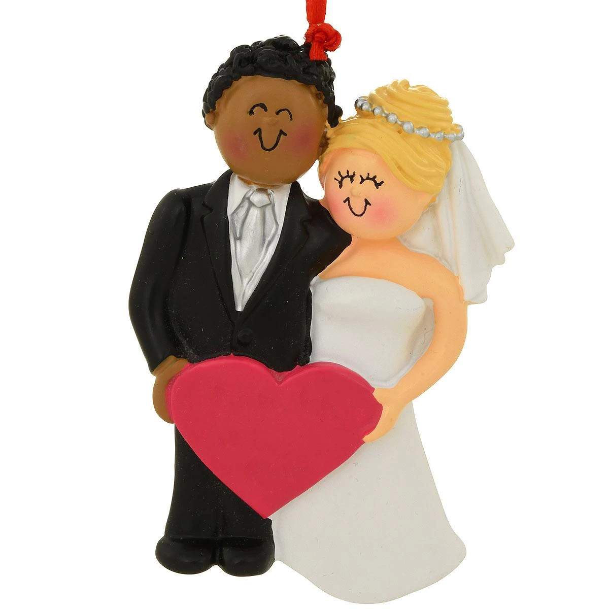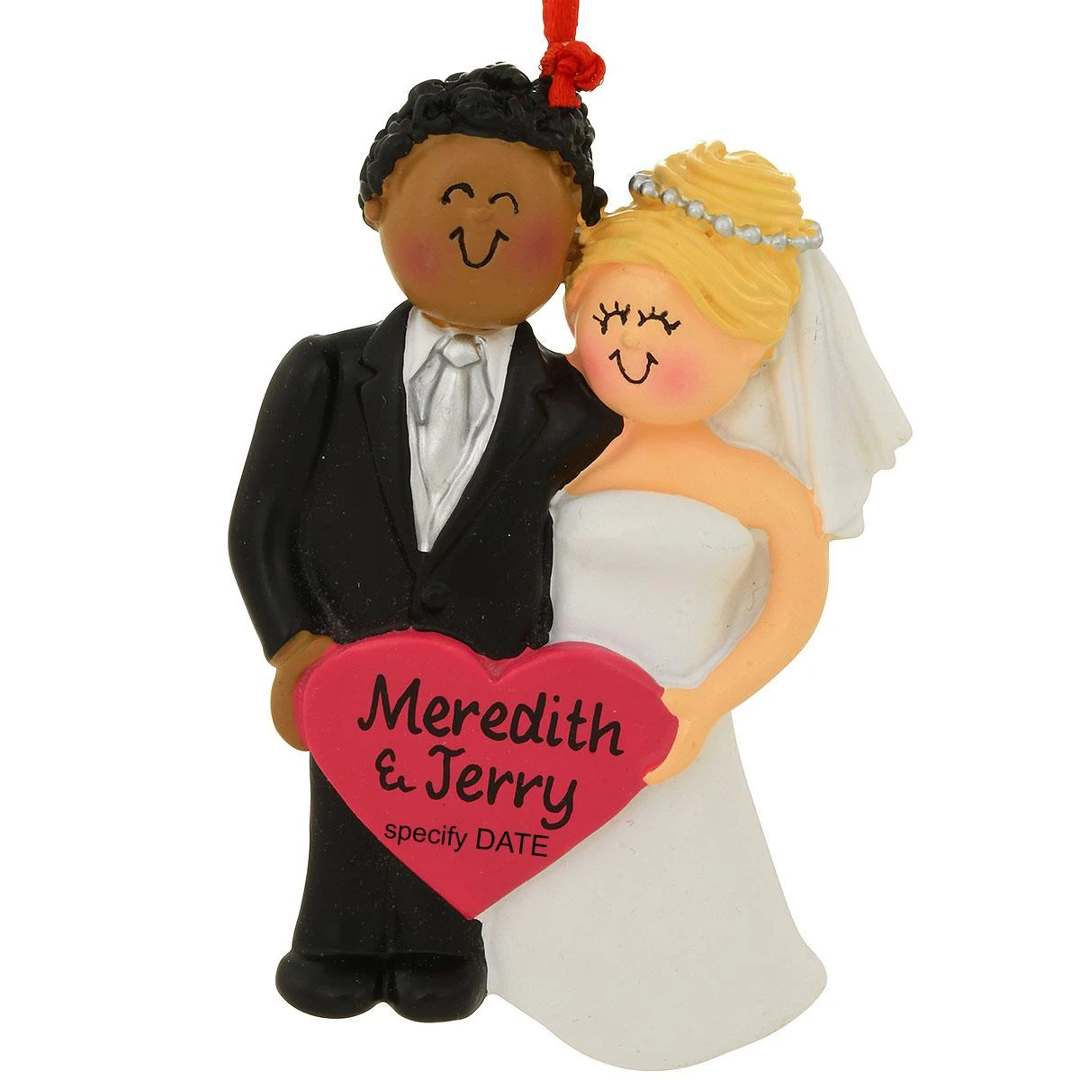 Here comes the bride … and groom marching down the aisle as Mr. and Mrs.! Depicting a beaming biracial couple in formal attire holding a heart (African American male with black hair and a white female with blonde hair) our wedding couple ornament makes a great gift and treasured memento of your couple’s special day! Allow one of our talented Bronner’s artists to add personalization with a black paint pen at no additional charge.
