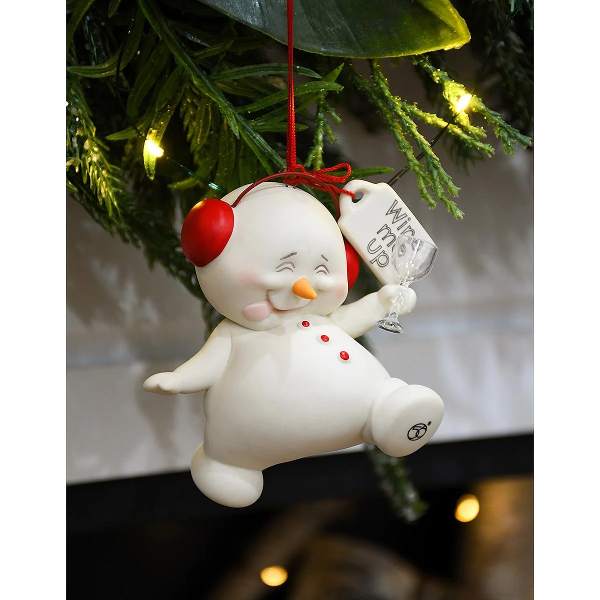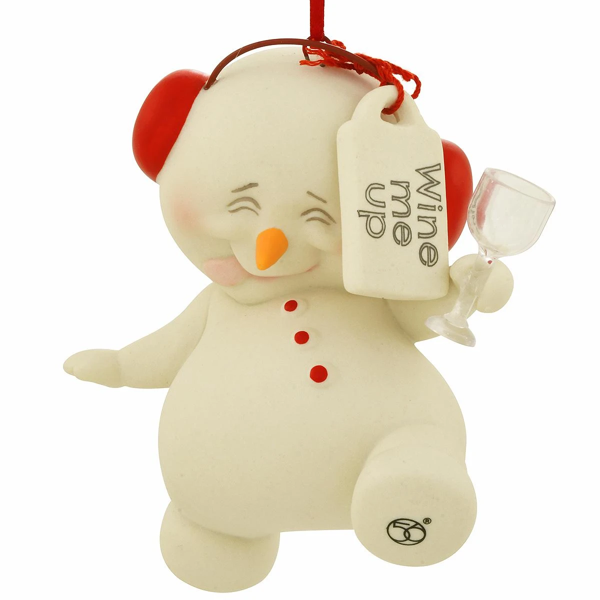 After imbibing on a glass (or three) of wine, a jolly snowman is ready to partaaay! Crafted of porcelain bisque with red painted accents, this cute Snowpinions® ornament comes ready to hang with a red ribbon and measures 3¼”. Sentiment tag reads: “Wine me up”.