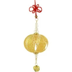 This elegant gold metal ornament features an open filigree design embellished with clear acrylic beads and a dangling gold jingle bell and will look as elegant in a window as it will on the tree! Coming ready to hang on a decorative red knotted cord, 6¾” ornament includes tag with “Make a Wish” message that reads,